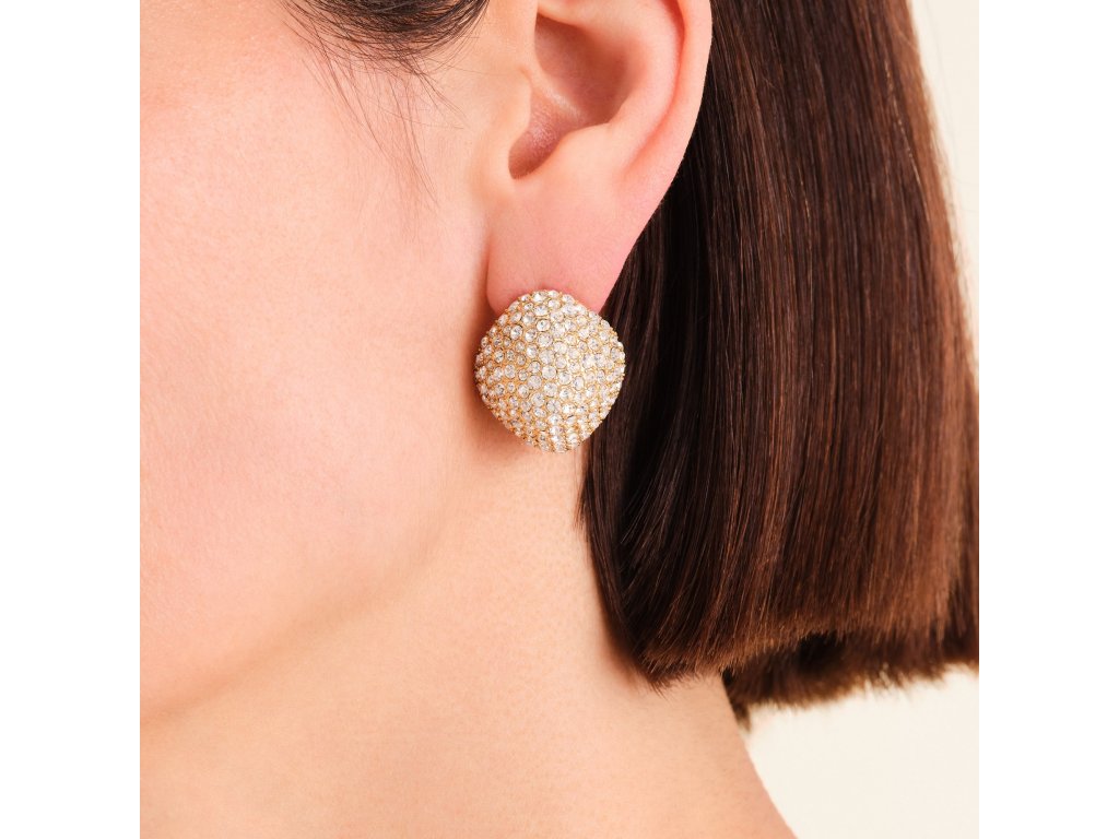 Kryštály zachytávajú svetlo z každého uhla a vytvárajú pôsobivú hru odleskov. Vďaka svojej veľkosti 2,5 x 2,1 cm náušnice vyniknú a upútajú pozornosť. Zapínanie na puzetu a kvalitná pozlátená nehrdzavejúca oceľ zaisťujú pohodlné nosenie od prvého prípitku až po posledný tanec.