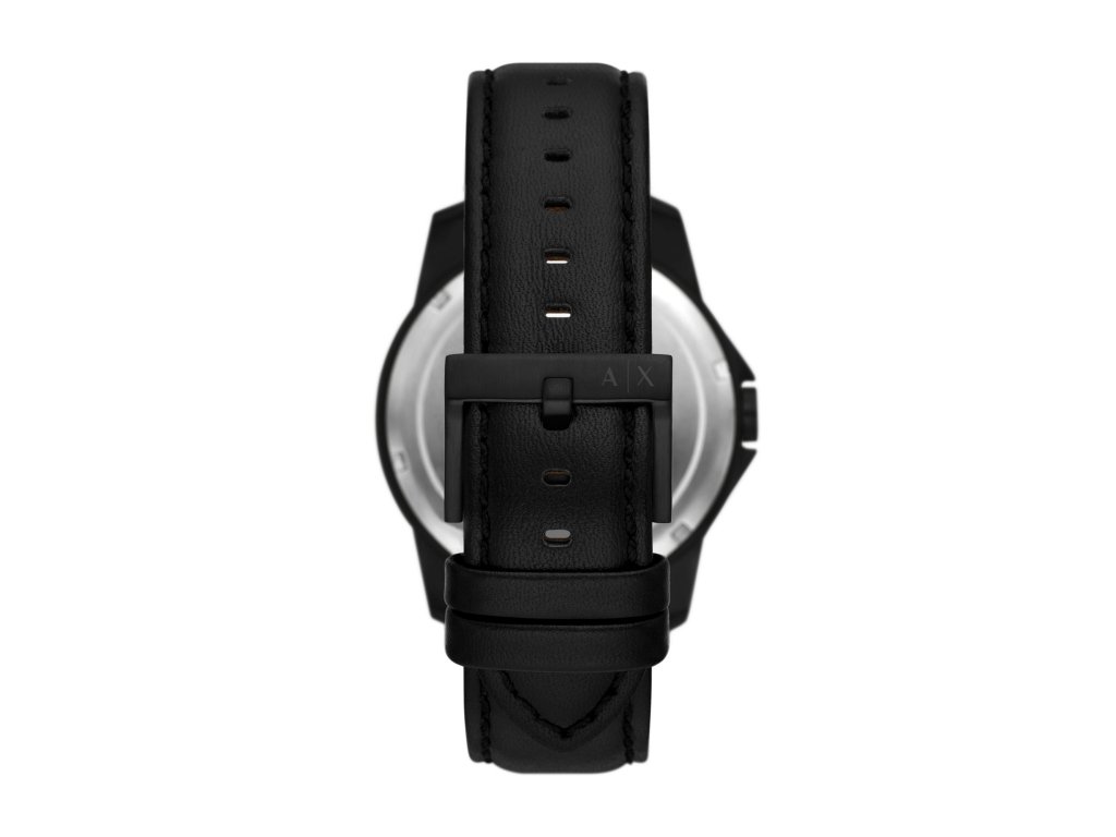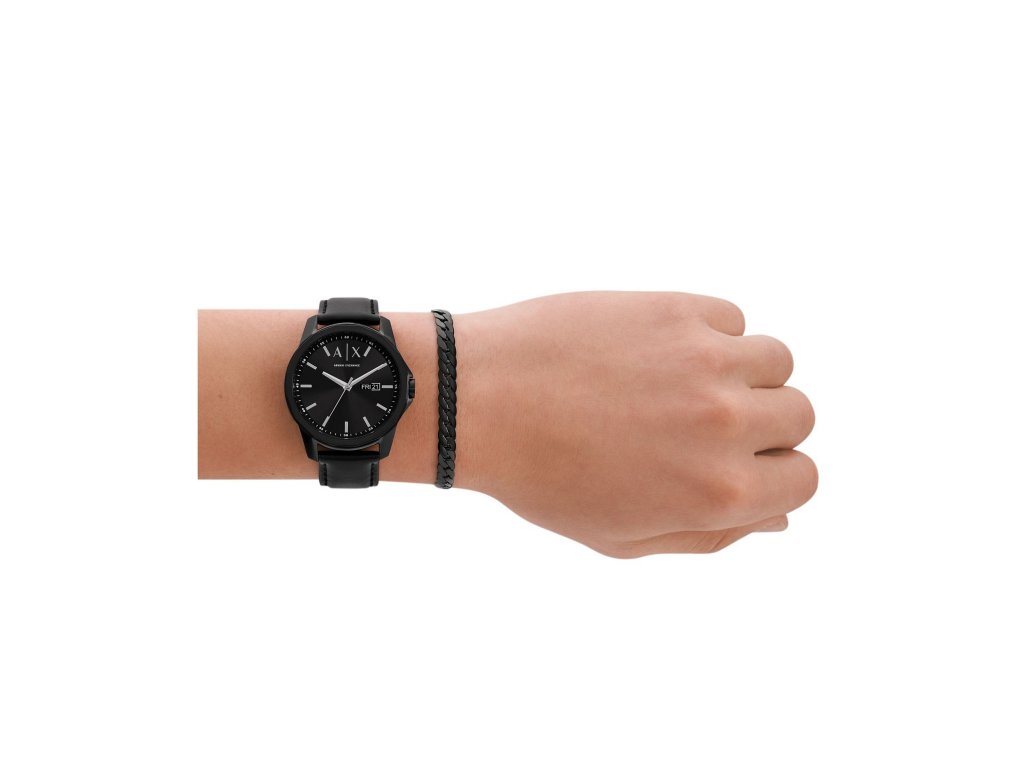 Model Banks AX7147SET je vybavený čiernym koženým remienkom, okrúhlym puzdrom z ocele v čiernom prevedení a čiernym číselníkom s priemerom 44 mm. Číselník je prehľadne rozvrhnutý s funkciou dátumovky aj zobrazením dňa v týždni. Celok dopĺňa minerálne sklo a spoľahlivý strojček Quartz.
