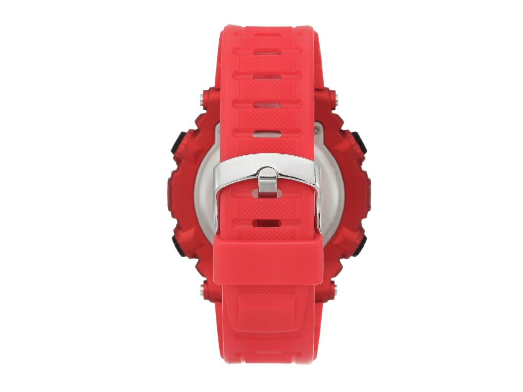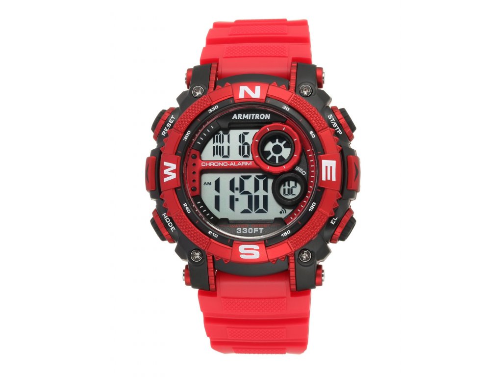 Športové digitálne hodinky s čiernou a červenou lunetou a bielymi značkami.