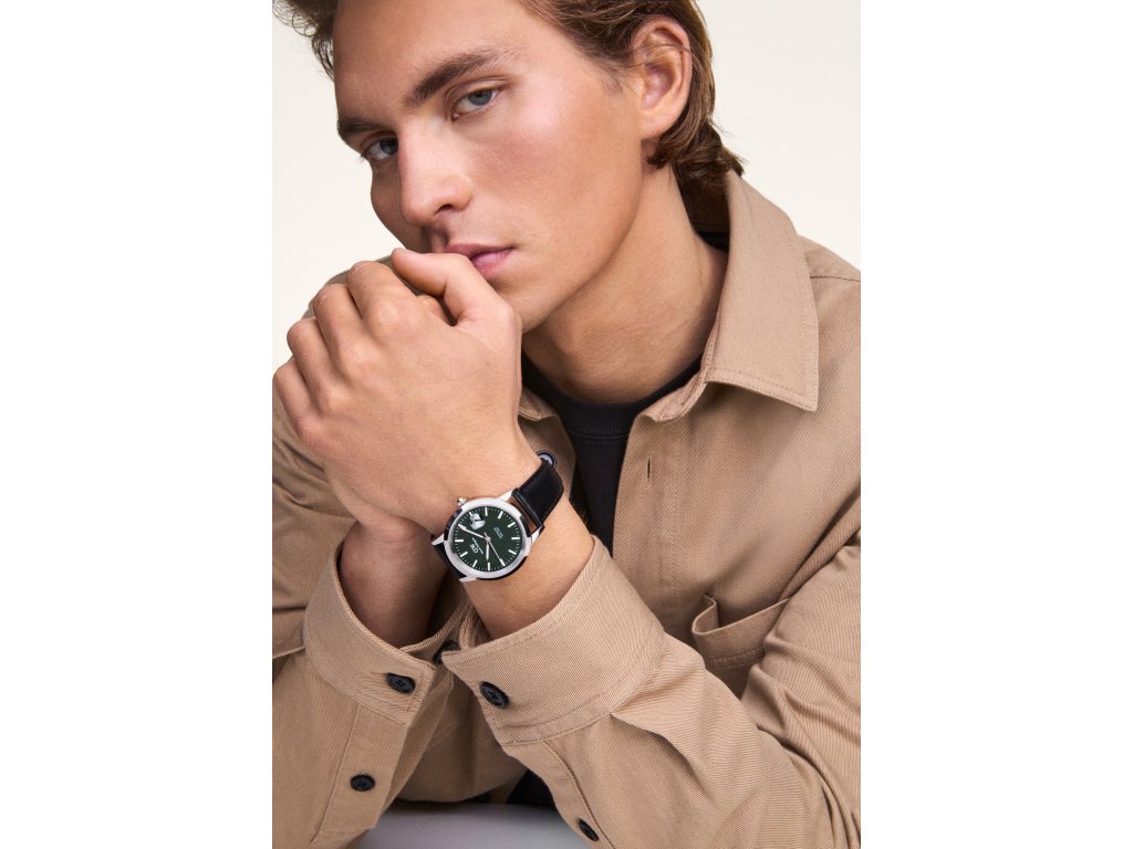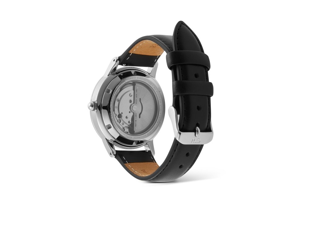 Robustné oceľové puzdro má priemer 40 mm, čierny remienok je vyrobený z kvalitnej kože a sklo je zafírové a mimoriadne odolné.Priehľadný zadný kryt odhaľuje fascinujúci automatický mechanizmus vo vnútri.
