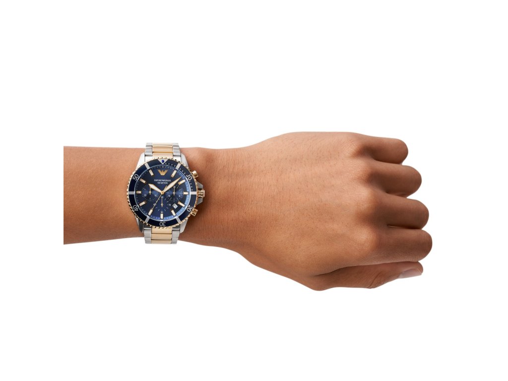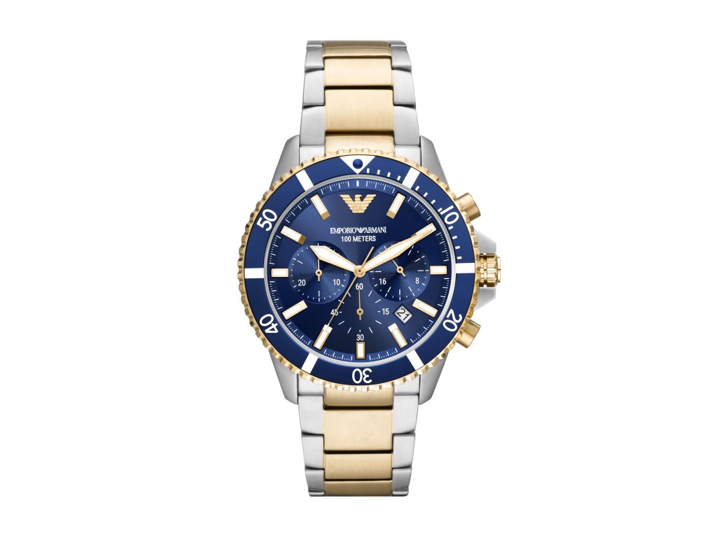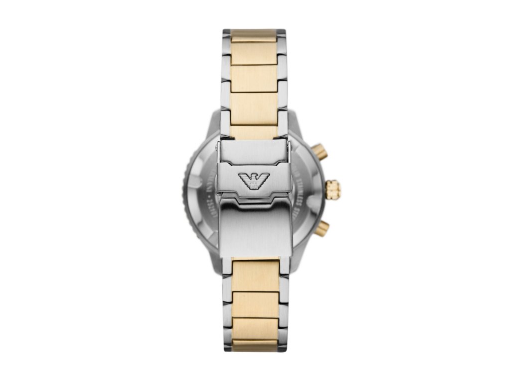 Modrý ciferník s priemerom 42 mm zdobia výrazné biele a zlaté detaily a ikonické logo orla Emporio Armani. V harmonickom kontraste pôsobí zlatostrieborný oceľový ťah.