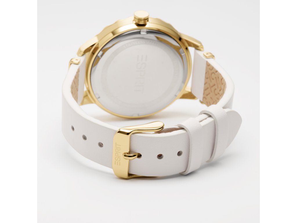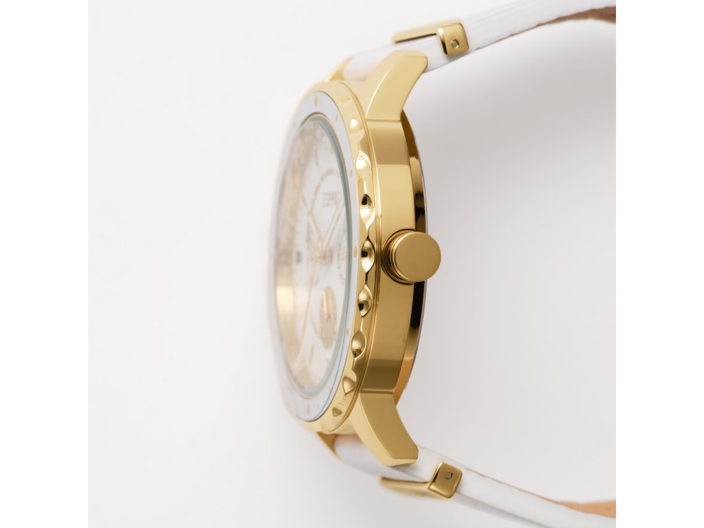 Veľkému 40 mm bielemu ciferníku dominuje chronograf, dátumovka, jednoduché indexy a moderné ručičky. Hodinky sú zasadené do okrúhleho zlatého puzdra z nehrdzavejúcej ocele, ktoré veľmi pekne ladí s bielym koženým remienkom. Celková kombinácia vyzerá štýlovo a nadčasovo.