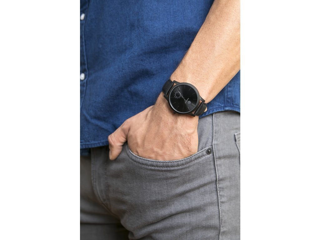 Čierny kožený remienok ponúka nielen pohodlie, ale aj elegantný vzhľad, ktorý dokonale ladí s puzdrom a okrúhlym ciferníkom rovnakej farby. Ciferník s priemerom 42 mm zdobia výrazné rímske číslice a jemné ručičky v striebornej farbe, ktoré zaručujú vynikajúcu čitateľnosť a podčiarkujú pútavý charakter hodiniek.