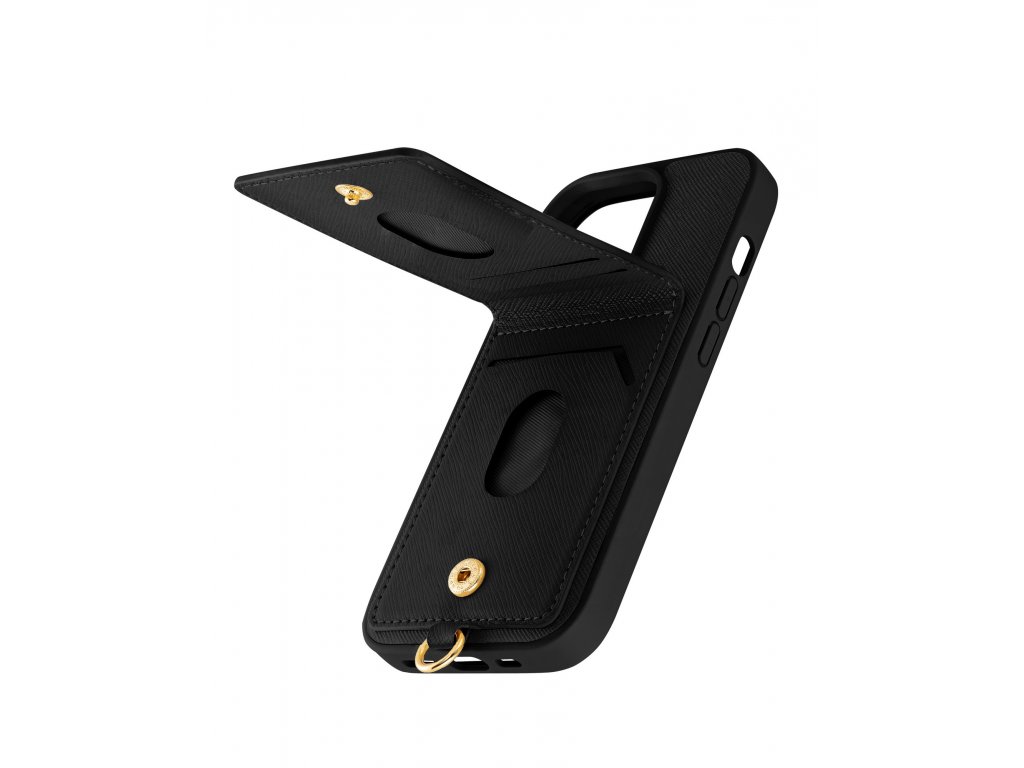 Tento čierny doplnok so zlatými detailmi, vyrobený z kvalitnej vegánskej kože s luxusnou štruktúrou saffiano, nielenže zabezpečí ochranu vášho telefónu pred poškriabaním a poškodením, ale zároveň dodá vášmu outfitu nádych elegancie a sofistikovanosti.