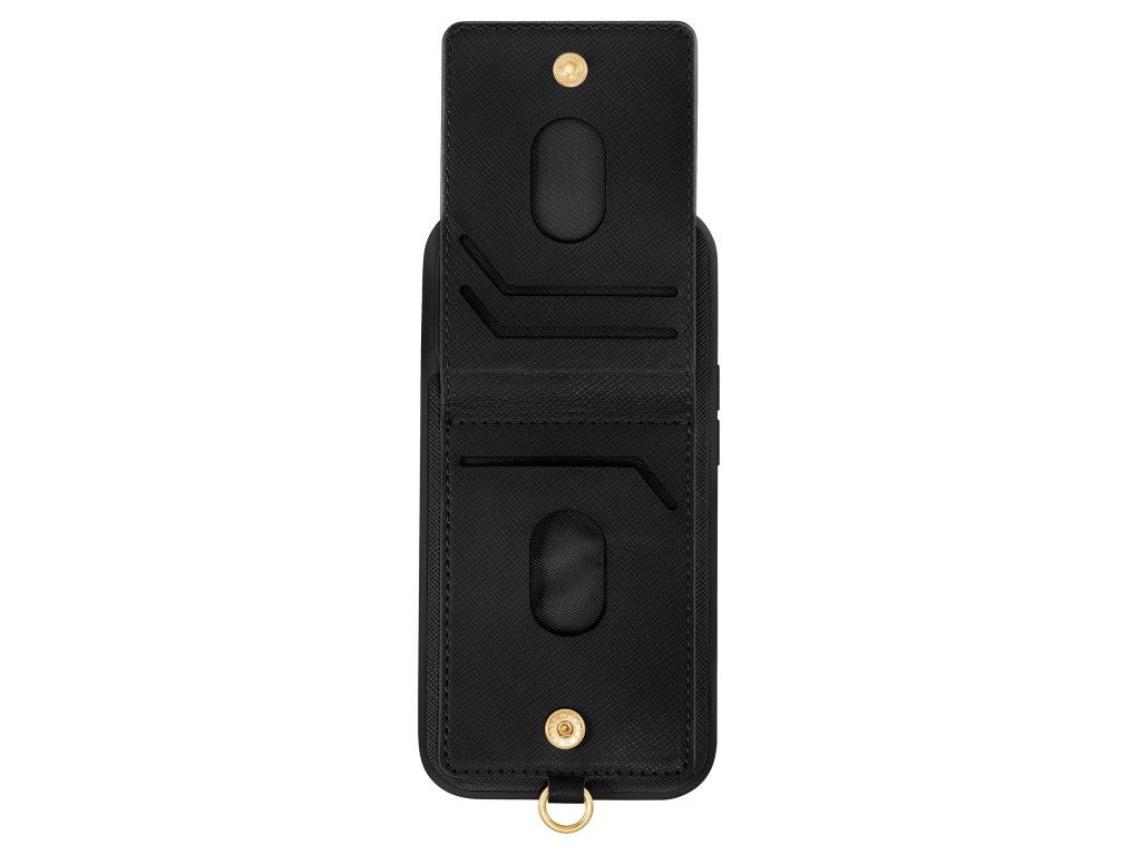Tento čierny doplnok so zlatými detailmi, vyrobený z kvalitnej vegánskej kože s luxusnou štruktúrou saffiano, nielenže zabezpečí ochranu vášho telefónu pred poškriabaním a poškodením, ale zároveň dodá vášmu outfitu nádych elegancie a sofistikovanosti.