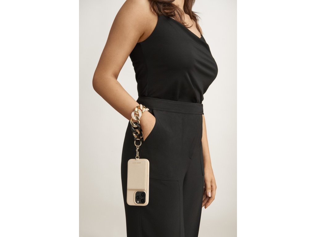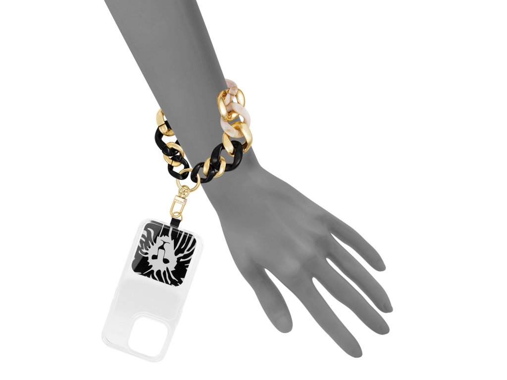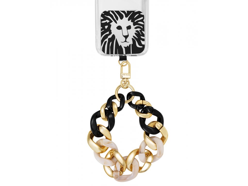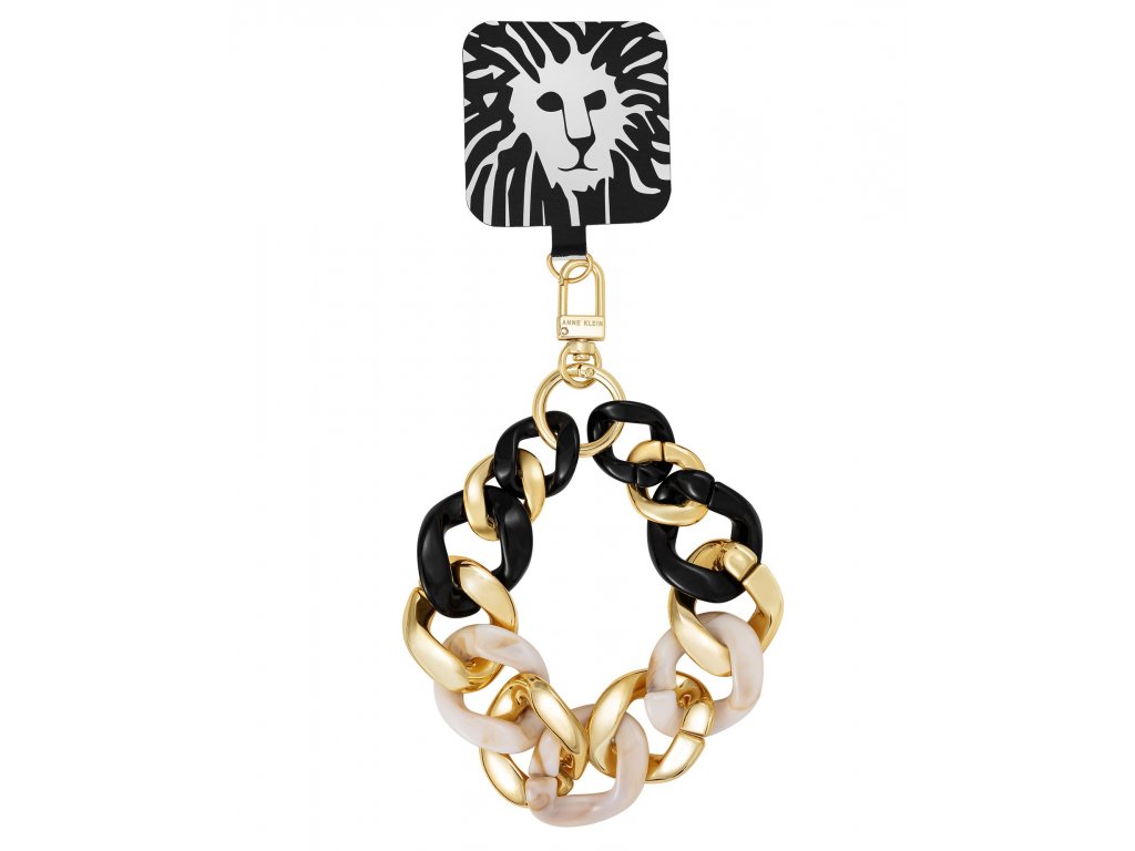 Popruh v pevnom retiazkovom vyhotovení je vyrobený z odolného plastu, na ktorý sa môžete spoľahnúť. Je atraktívna vďaka módnej a nadčasovej kombinácii čiernej, zlatej a krémovej farby, ktorá z nej robí neprehliadnuteľný doplnok. Anne KleinK telefónu sa pripája pomocou pozlátenej kovovej karabínky s logom svetoznámej značky .