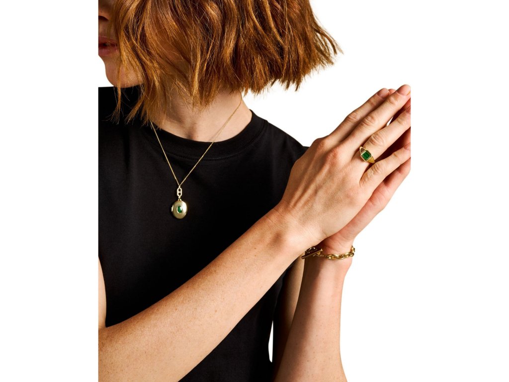 Dámsky prsteň v dizajne signetového prsteňa je vyrobený z pozlátenej mosadze a osadený výrazným zeleným malachitom. Hladká kovová konštrukcia prsteňa kontrastuje s prírodným kameňom a vytvára harmonický a elegantný doplnok, ktorý vynikne na každej ruke. Zlatá a zelená je obľúbená kombinácia, ktorá je nadčasová.